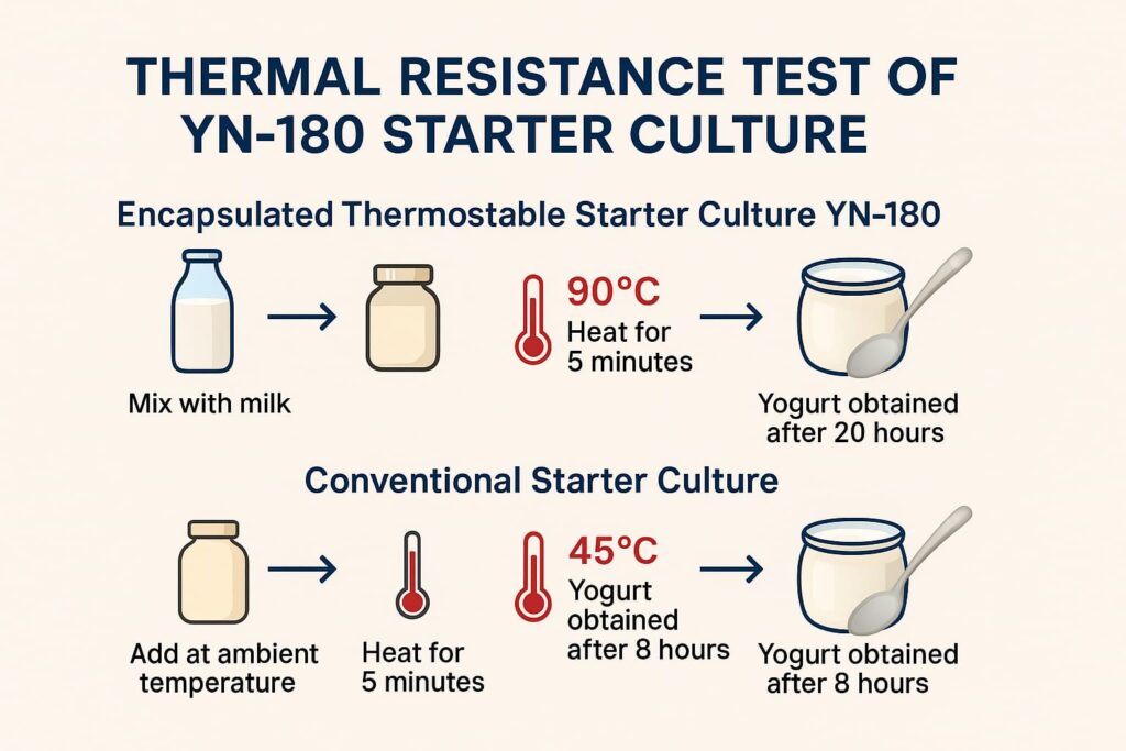 Con el objetivo de evaluar la eficiencia y resistencia térmica del cultivo iniciador biocapsulado YN-180, se llevó a cabo un ensayo comparativo frente al método convencional de producción de yogur.
